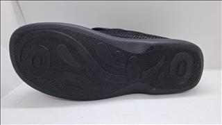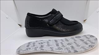 Zapatilla de casa para mujer, muy cómoda , estilo copete anatómico con práctico velcro para un mayor ajuste, en tejido escamas aranda, en color negro, y pala en licra también negra. Forro y plantilla extraíble de tejido suave gris de invierno con aloe vera. Piso de caucho vulcanizado negro con cuña de 3,5 cm. Fabricada en España.